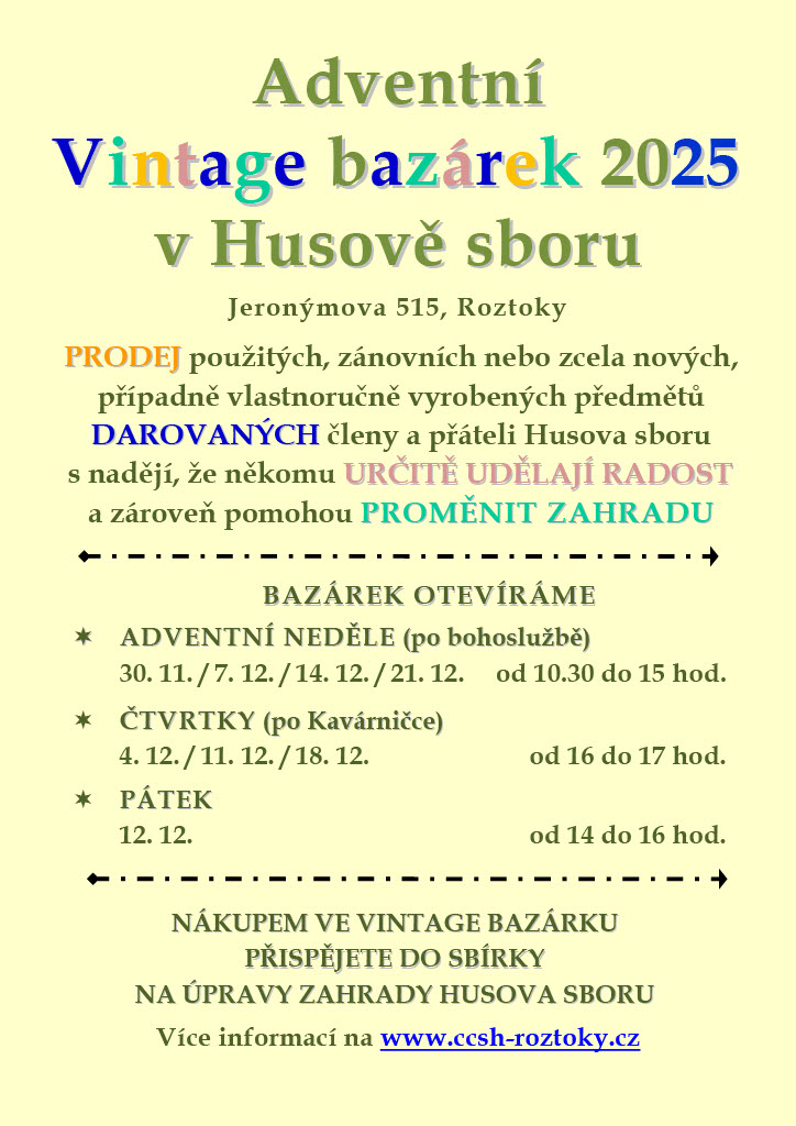 Vintage Bazárek jsme se rozhodli uspořádat na podporu aktivit Husova sboru v Roztokách. ZA MÍRNÉ CENY NABÍDNEME DAROVANÉ VĚCI - použité, zánovní nebo nové, případně vlastnoručně vyrobené, pro které současný majitel nemá využití, ale jsou tak pěkné, že zcela jistě udělají radost někomu jinému. Třeba i vám!